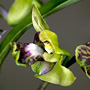 Epiphytic or lithophytic herb forming small clumps. Pseudobulbs erect, cylindrical or middle slightly swollen, 5-25 cm x 0.6-1 cm, dark purplish brown, hard, covered in papery bracts when young, becoming furrowed with age. Leaves 2-5, erect, apical, distichous, sessile, bases sheathing pseudobulb; lamina narrowly ovate, 5-10 cm x 1.5-2 cm, dark green, apex unequally acuminate. Inflorescence an axillary raceme, erect to arching, 40-80 mm long, from upper nodes of pseudobulb; pedicels 10-20 mm long. Flowers 2-7, resupinate, porrect, star-shaped, 15-20 mm x 20-25 mm, pale green or yellowish with deep purple labellum. Sepals and petals widely spreading, moderately thick-textured. Dorsal sepal projecting forwards, ovate, 6-10 mm x 5 mm, apex acute. Lateral sepals widely divergent, triangular, 8-12 mm x 5 mm, bases fused to column foot, apex acute. Petals narrowly ovate, 5-8 mm x 3 mm, apex acute to acuminate. Labellum curved, 10 mm x 7 mm, 3-lobed; lateral lobes large, erect, triangular; midlobe broad, with 2 parallel ridges, margins erect, flanking column, apex deeply emarginate. Column 3 mm long. Column foot curved, 7-8 mm long. Capsules pendulous, dehiscent.