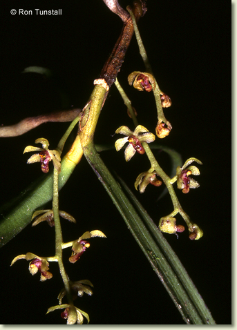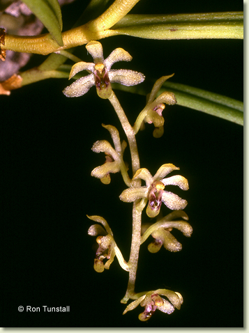 Epiphytic or lithophytic herb forming single growths or straggly clumps. Roots numerous, coarse, stiff, from nodes. Stems sparsely branched, erect to pendulous, 10-60 cm long, straggling when longer. Leaves 3-15, scattered along stem, widely spaced, prostrate, distichous, alternate, sessile, bases sheathing stem; lamina linear to oblong, 3-7 cm x 0.4-0.6 cm wide, yellowish green, stiff, leathery, margins revolute, apex uncinate. Inflorescence an axillary raceme, porrect to arching, 30-60 mm long, emerging opposite a leaf; pedicels 2 mm long. Flowers 5-15, resupinate, porrect to nodding, star-shaped, 6-7 mm x 6-7 mm, cream, pale green or brownish with purplish markings, fragrant. Sepals and petals widely spreading. Dorsal sepal obliquely erect, narrowly obovate, 3.5 mm x 1.5 mm. Lateral sepals free, widely divergent, oblong to obovate, 3.5 mm x 1.5 mm. Petals falcate, 3 mm x 0.8 mm. Labellum hinged, 1.2 mm long, with a few red or purple markings, 3-lobed; lateral lobes 1.7 mm x 1 mm, slightly incurved; midlobe 1.2 mm long, rounded, hollow, containing sticky nectar. Column slightly curved, 1.5 mm long. Column foot 0.8 mm long, at right-angles to column. Capsules porrect, dehiscent.