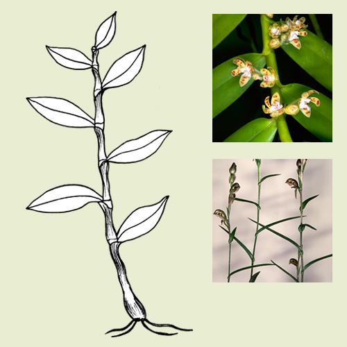 Scattered along stem or pseudobulb: the leaves can be arranged opposite or alternate along a stem or pseudobulb.
