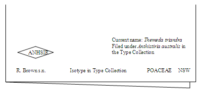 Packet – specimens stored in printed packets were databased before incorporation, with details printed directly from the ANHSIR database. All label information is printed on the front of the packet, except the CANB/CBG accession number which is printed on the back. Specimens originally received as exchange from other institutions may have the labels supplied by the donor institution stored inside the packets