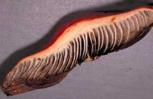 The V-shape of the gill cross section is exaggerated in the diagrams. The photo shows a slice taken from the cap of a mushroom of Hypholoma aurantiaca. You can see the white flesh that makes up the relatively narrow V-shape in each of the gill cross-sections. The gill faces have numerous basidia bearing dark brown spores - hence the dark coloured areas on either side of each gill section.