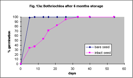 Six-month-old and 23 month old seed was used in this trial but otherwise the methods were the same as for Austrodanthonia caespitosa. With 6 month old seed removal of the seed coat dramatically increased the speed of germination but not the ultimate percentage (Fig. 13a). This effect was not significant with 23 month old seed (Fig.13b). In another experiment with freshly collected seed there was no significant difference between seeds with seed coat on and those with it removed. However the maximum germination percentage was only 51% and the experiment was also badly contaminated with fungi. Like Austrodanthonia caespitosa the seed is quite hard and it should be possible to remove the coat with a machine.