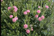 In front of the Café, Pimelea ferruginea [Section 244] is a small shrub with shining leaves neatly arranged along the upright stems, which are tipped with rounded clusters of tiny pink flowers. Croweas along this path include Crowea Southern Stars [Section 240], with small fine petals, and Crowea Coopers Hybrid [Section 240], with larger pink flowers. Banksia integrifolia var. integrifolia [Section 240] is dense and prostrate with upright cylindrical lemon flower spikes while, in the diagonal corner, Banksia Giant Candles [Section 143] is a large rambling shrub exhibiting elongated slim golden flower spikes. At its base, Correa Dusky Bells [Section 143] is a low shrub displaying its red tubular bell flowers amid dense foliage. Crowea Pink Blush [Section 240] is a small open shrub well covered with pink buds and pink, almost white, star flowers. Walking uphill, Callistemon Splendens [Section 10] is of medium size showing off its bright red bottlebrush flowers. Nearby Micromyrtus leptocalyx [Section 10] is a small shrub with tiny cream flowers hugging its erect branches. Thryptomene saxicola Pink Lace [Section 10], under the mottled grey limbs of the lovely Eucalyptus mannifera [Section 10], has tiny pink flowers hugging its low, lateral branches.