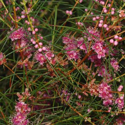 distribution mapLeaves are up to 2.5 cm long and linear. They emerge from the greyish papery stems in opposite pairs either at right angles or reflexed and the effect is spiky. When bruised their perfume is sweet and spicy. General appearance through the year is dull or inconspicuous, but the flowers always attract attention when the season begins in October or even mid-September in early years. They are set close on the stems in whorls of three of four in the axils of the leaves, and like them are very regular and neat. Opening first at the stem tips, flowers are cup-shaped with stamens very prominent giving a fringed effect. Colour may be white, cream or pink and the pink forms deepen to red with age so that there is always a range of soft carmine tints along the stems. Bees are often seen visiting the small flowers. New tips are growing as flowering passes, and these when half ripe are used as cuttings for propagation. Seed has not been found here.