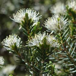 distribution mapIt forms a shrub or small tree some 2.5 - 4 m tall which is fairly dense. The branches of the plant are rigid and tortuous and the leaves linear to oblong, up to 1cm long and dark green in colour. Stems and trunk are clad in a pale papery bark which contrasts well with the foliage. Judicious pruning should be carried out to expose the trunk and lower branches so that this feature can be accentuated. The cream flowers, in brushes, are borne at the ends of the branches and are seen from September to November.