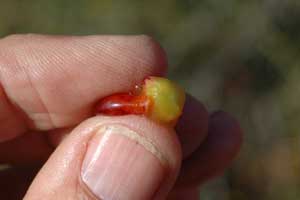 The mistletoe fruit is a single-seeded berry, often brightly coloured (above right), with striking adaptations for bird dispersal, germination and attachment. Under the outer coat of the fruit is a sticky layer of viscin, which is rich in glucose, and which envelops the seed (second right). Birds which feed on the fruits often have specialized feeding behaviour, swallowing the seed whole after squeezing it from the fruit coat (below right). Birds have been reported nipping the end off the fruit, as though removing a cap, prior to squeezing out the seed. Notable dispersal agents are the Mistletoe Bird (Dicaeum hirundinaceum, below) and some honeyeaters in Australia (Grantiella, Acanthagenys, Plectorhyncha), and the Phainopepla (Phainopepla nitens) and euphonias (Euphonia spp.) in the south-western United States.