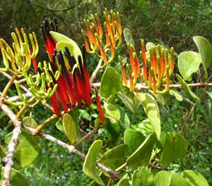 There are a few other mistletoe species in the Pacific with apparently waif distributions, although less spectacular. The three species in New Caledonia, Amyema artensis, A. scandens and Amylotheca dictyophleba